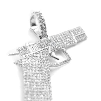 Gun diamond-studded pendant is a unique and edgy piece of jewelry, featuring a detailed gun-shaped design embellished with carefully set diamonds. The diamonds add a touch of sparkle to the pendant, creating a statement accessory that merges bold style with elegance.