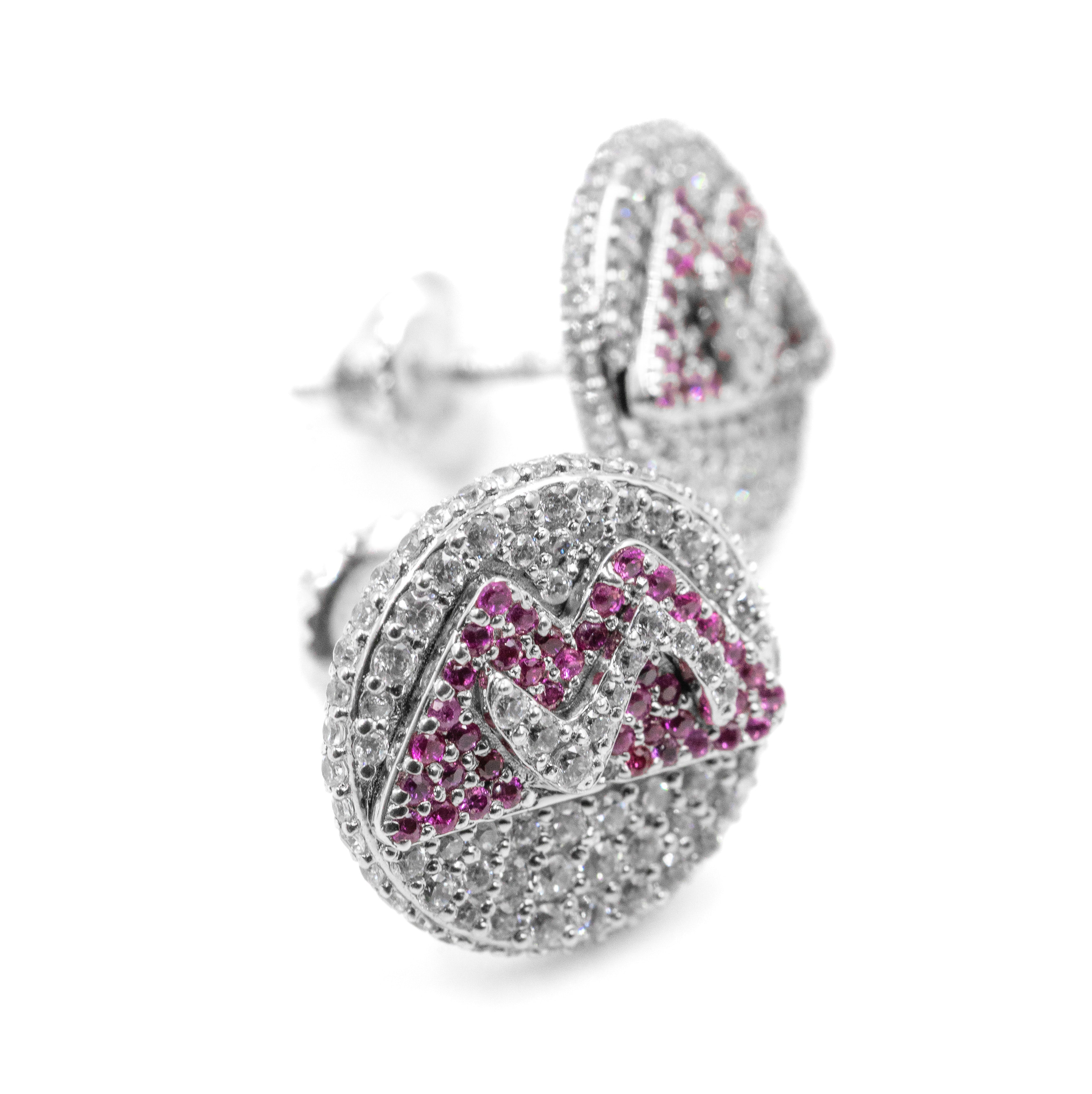 The S Earrings are the perfect blend of bold energy and clean shine—made for anyone who wants their jewelry to speak before they do. These round stud earrings feature a standout S-shaped center crafted with vibrant pink stones, surrounded by full micro-pave white diamonds for that signature ice jewelry shine.
