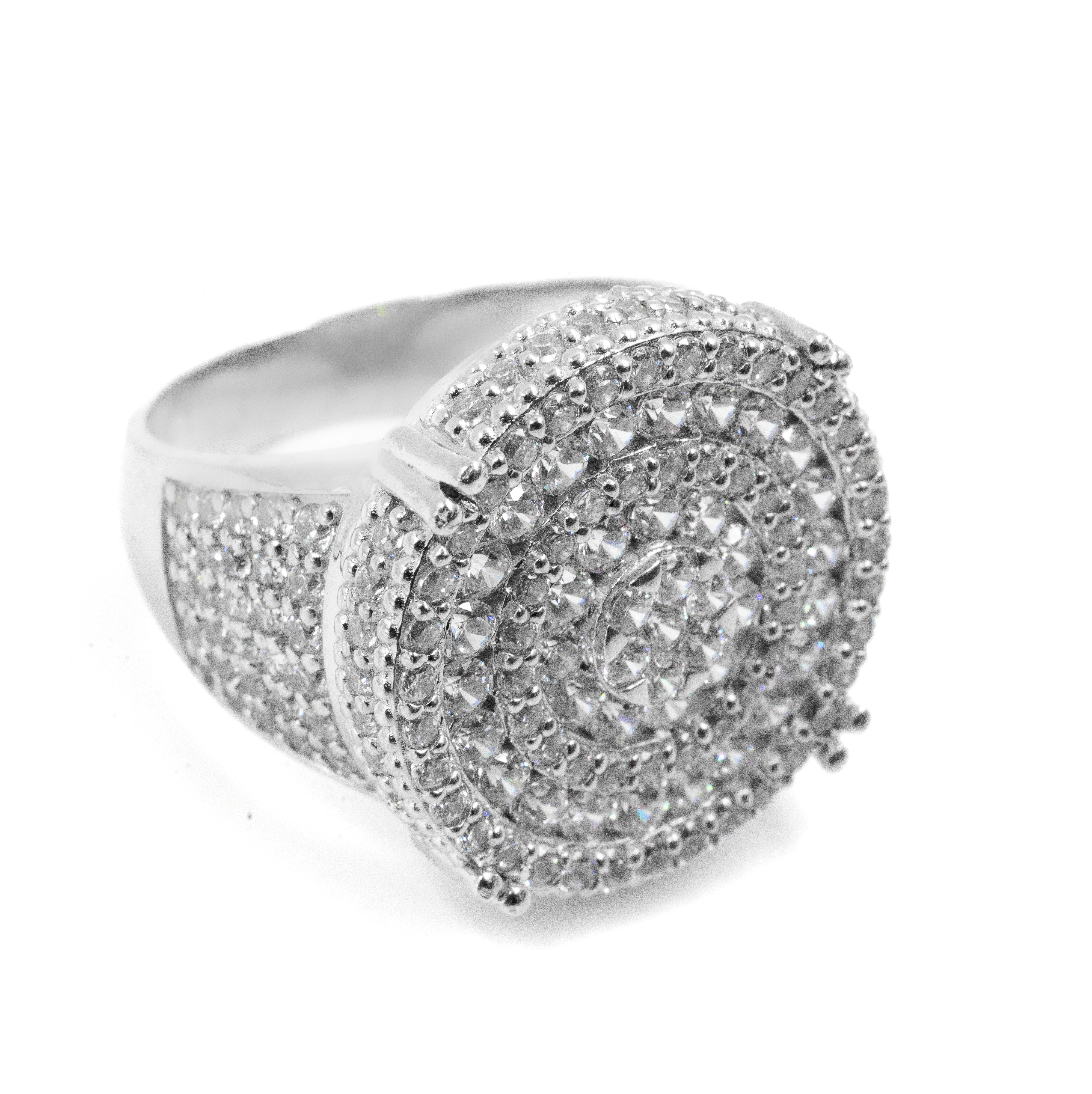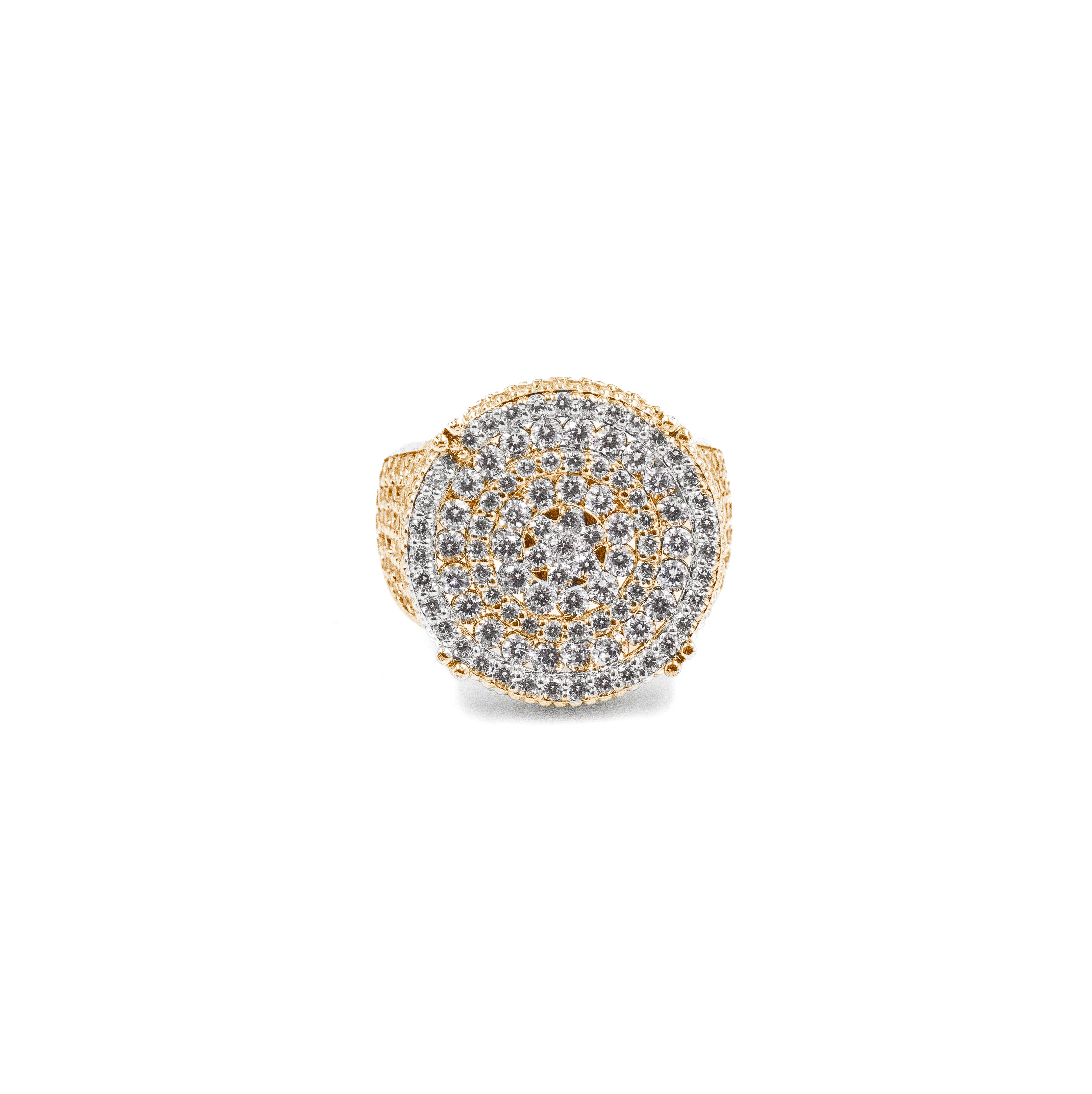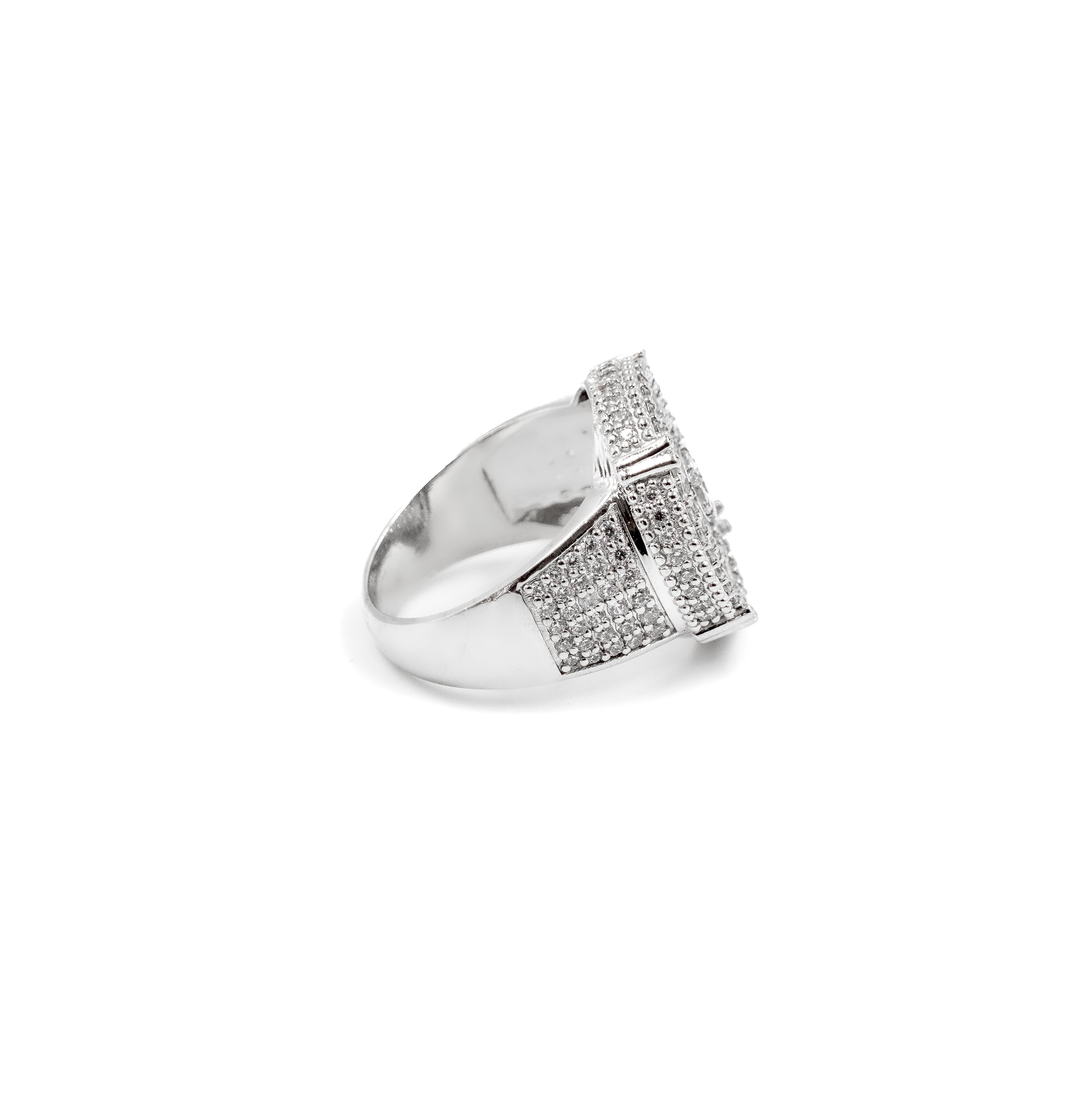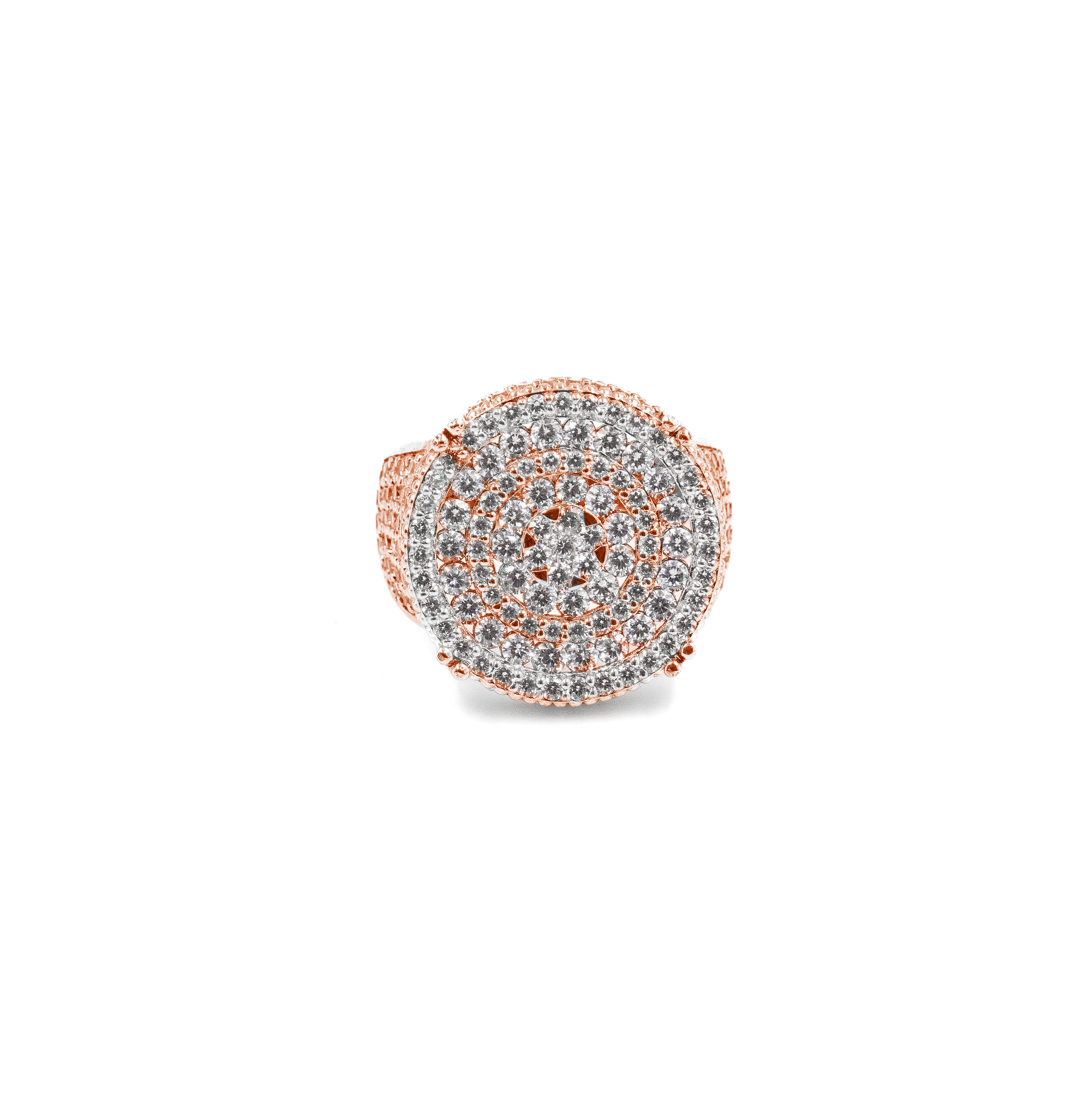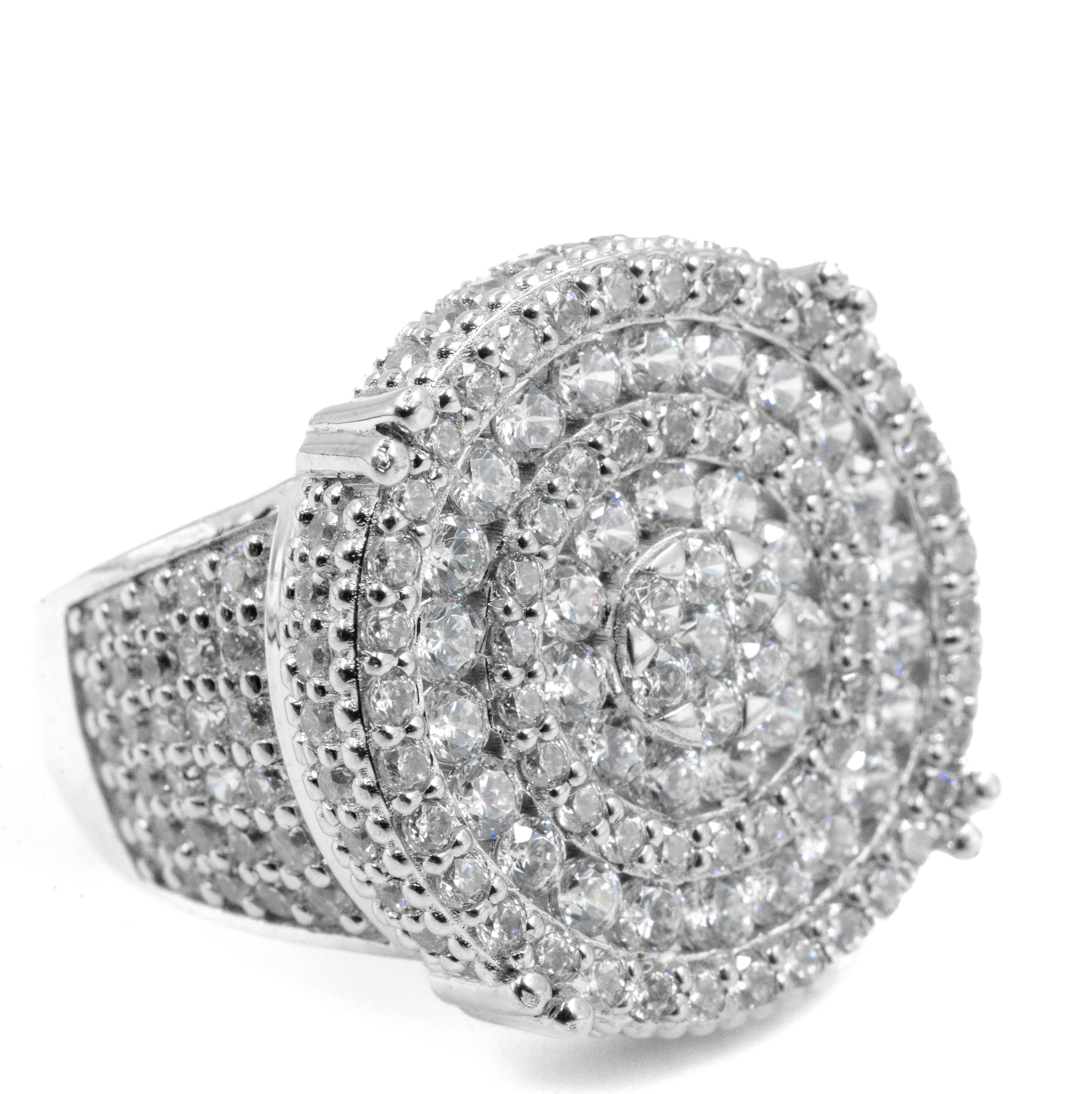 Meet the ultimate iced-out statement. Our Five Row Round Ring features a fully diamond-covered round table and five rows of stones flowing down the shank for maximum shine.